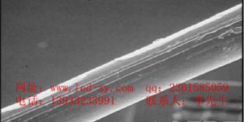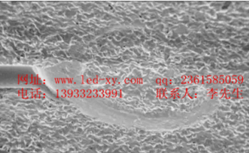 這部分主要是瓷嘴質(zhì)量問題,使用超過壽命所致;瓷嘴壽命不能以固定“實際打線產(chǎn)量”為準(zhǔn),而是結(jié)合焊線效果決定;當(dāng)不足產(chǎn)量要求時,若已經(jīng)造成焊線效果不合格(結(jié)合高倍率顯微鏡檢驗),也應(yīng)立即更換;另外,人工返工塌線修線不當(dāng)亦可造成金線刮傷。上圖為金線刮痕。