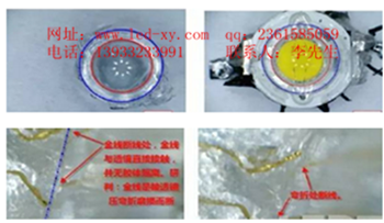 4.2.造成斷線的因素眾多,從不良樣品分析看,透鏡內(nèi)壁邊緣壓彎折金線造成金線破損是根本原因。且所有分析的未死燈的良品中,拆下透鏡,都可以發(fā)現(xiàn),金線彎折處是直接接觸透鏡邊緣,金線與透鏡之間并未有膠體隔離,極易于使金線與透鏡之間形成摩擦使金線破損斷線;另從過去的異常“熒光粉處斷線”來看,可以說明“外力致使金線斷線”這一點。